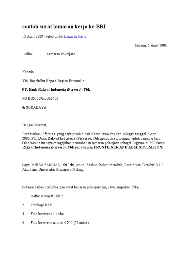 Contoh surat lamaran kerja di bank bri dalam bahasa inggris.